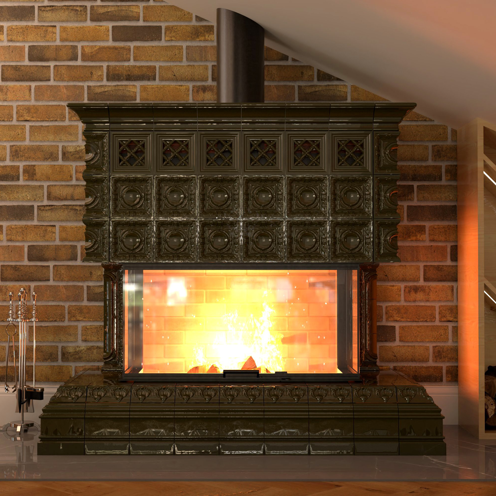 Камин с трёхсторонней топкой в изразцовой облицовке "Птички"