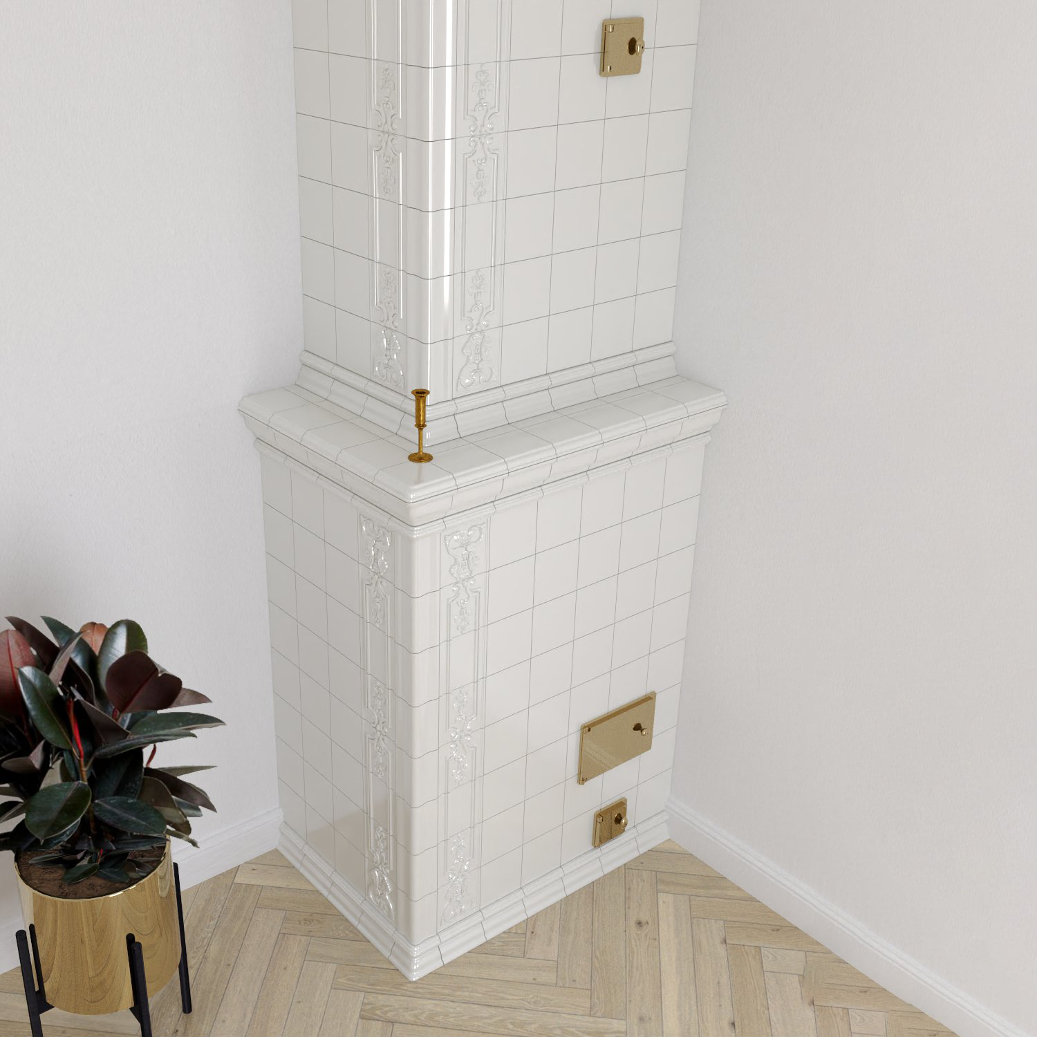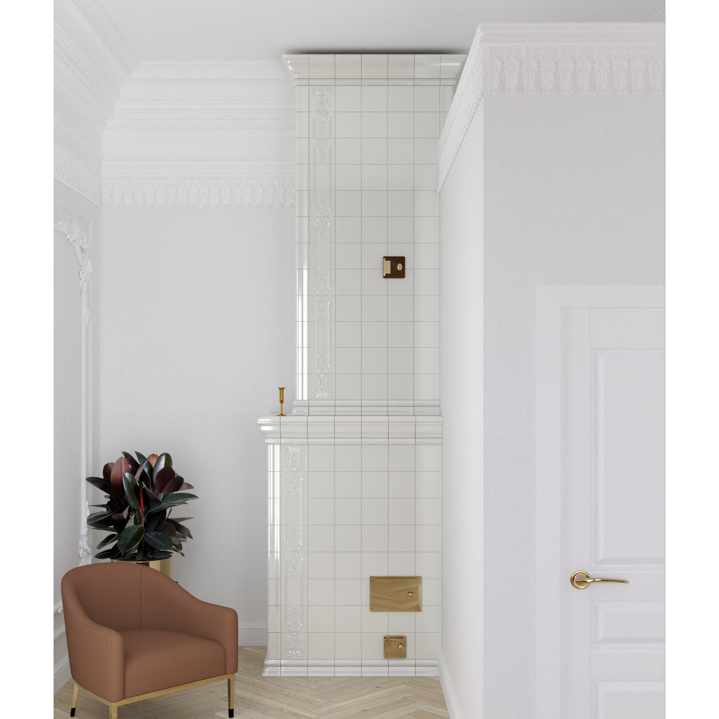 Подготовить проект облицовки декоротивной печи в спальне в белой плитке с минимальным узором.