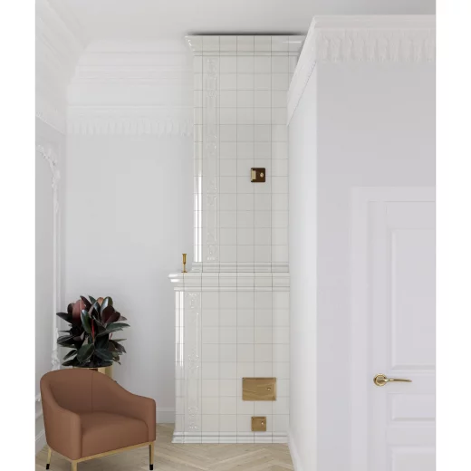 Проект облицовки декоротивной печи в спальне в белой плитке с минимальным узором