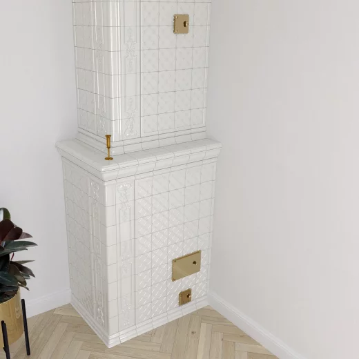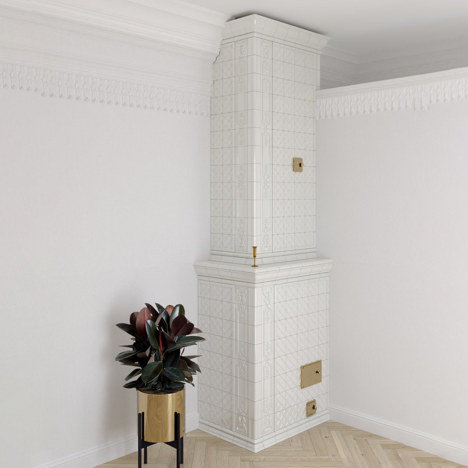 Проект облицовки декоротивной печи в спальне в белых изразцах коллекции Альбион