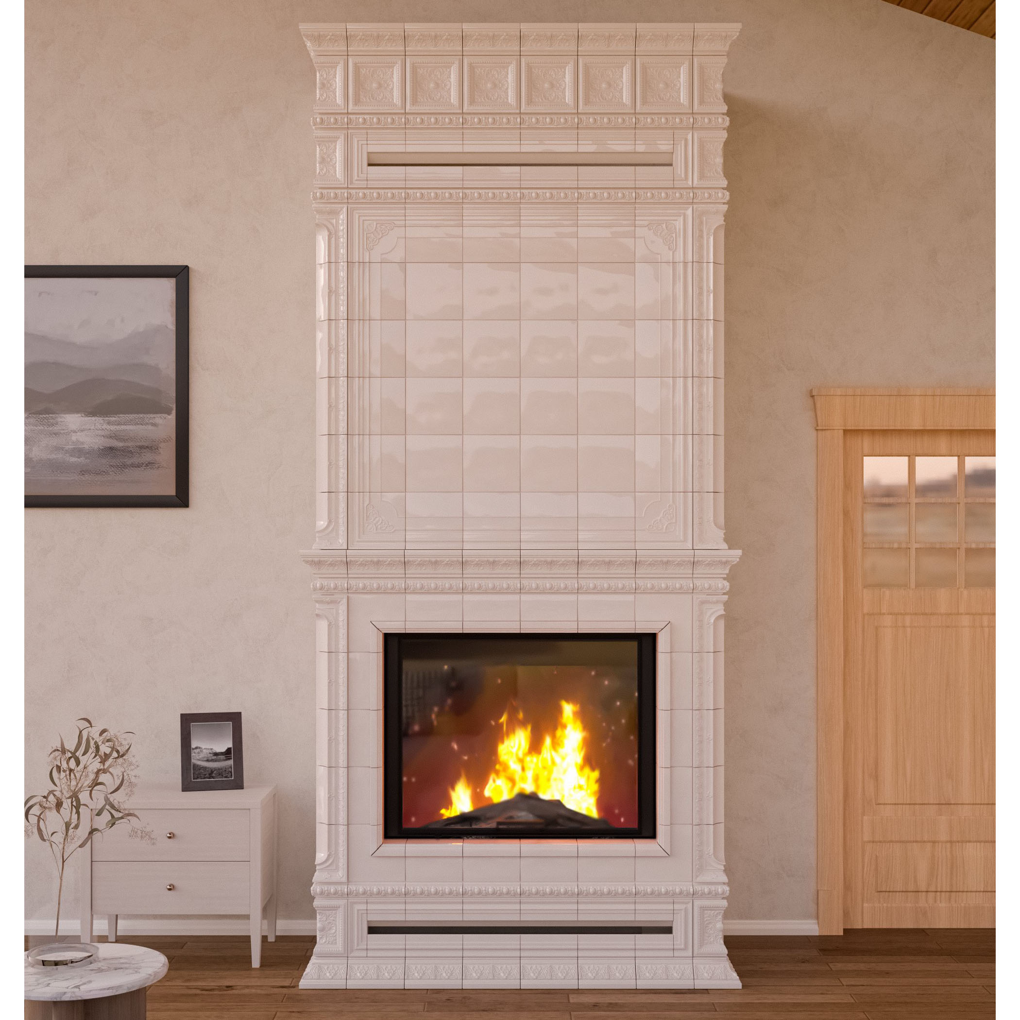 Камин с трёхсторонней топкой в изразцовой облицовке "Птички"