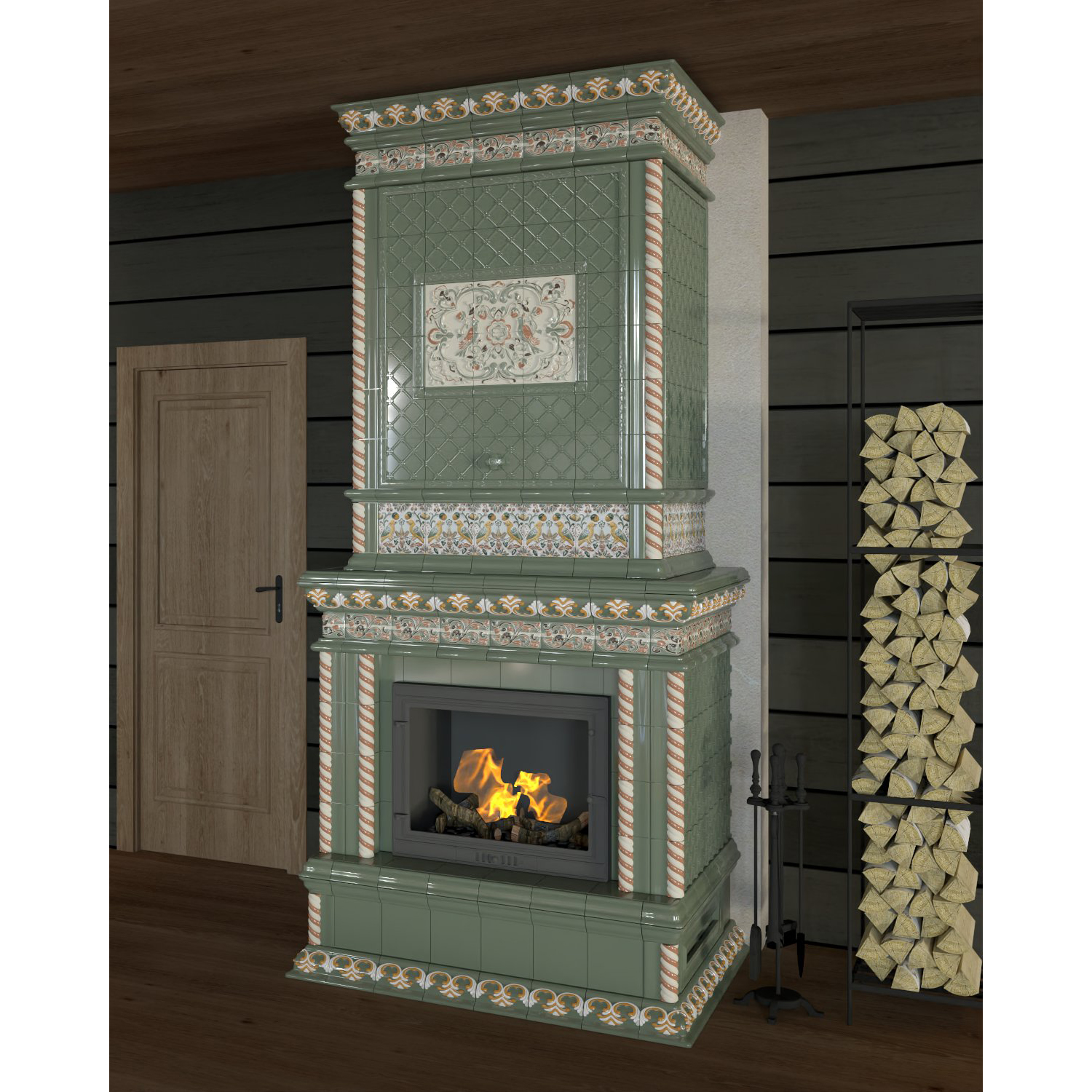 Проект облицовки дровяного камина в зеленом цвете и коллекции Птички