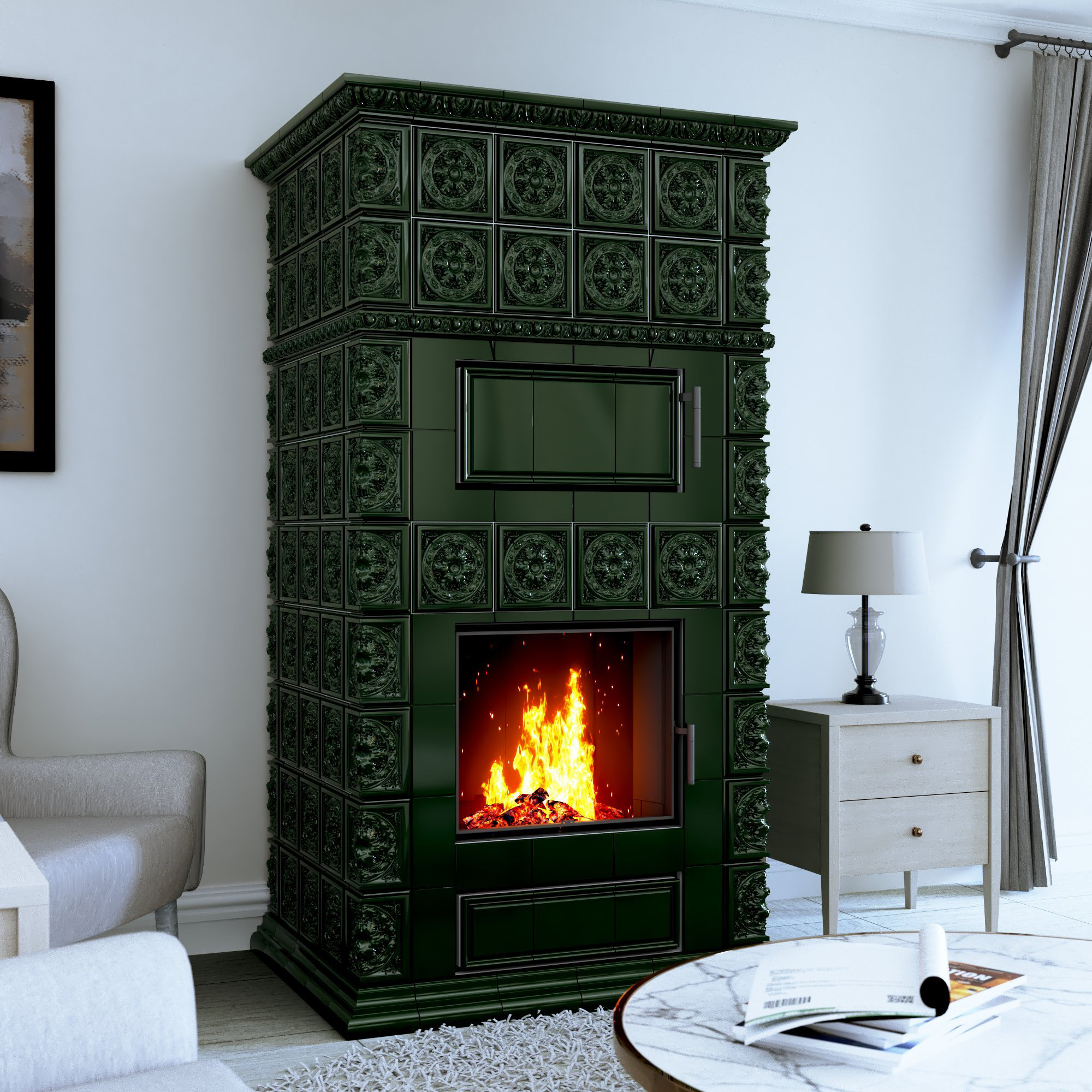 Подготовить проект облицовки дровяного печь-камина с духовкой ROSAMO V1 Tulikivi в зеленом цвете.