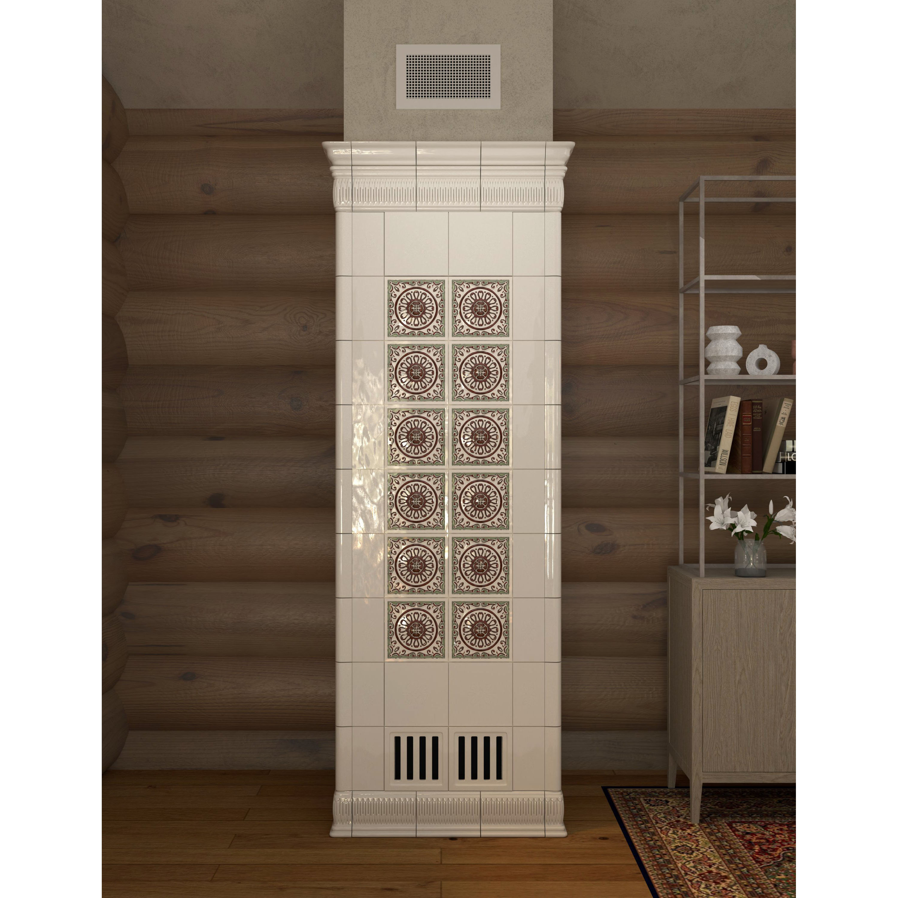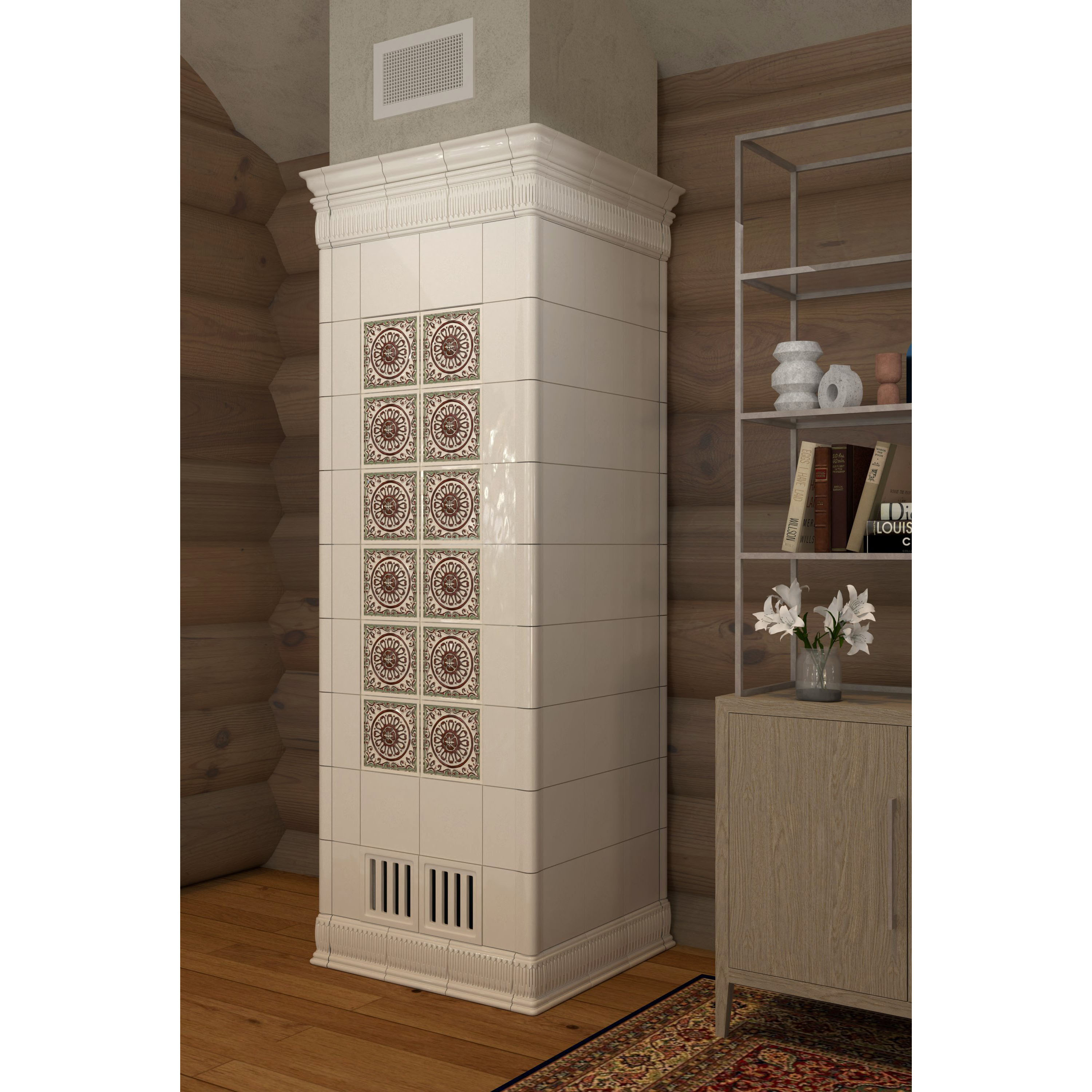 Печь-голландка с изразцами CeramicaDecor в интерьере деревянного дома