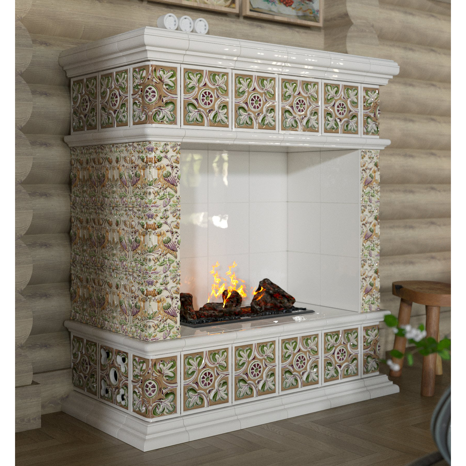 Камин с угловой топкой в изразцовой облицовке "Тюльпан"