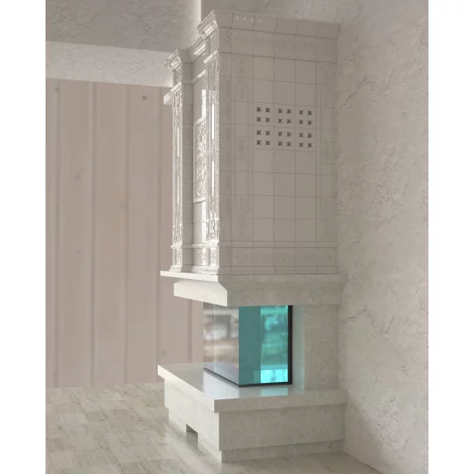 Камин с трёхсторонней топкой в изразцовой облицовке "Птички"
