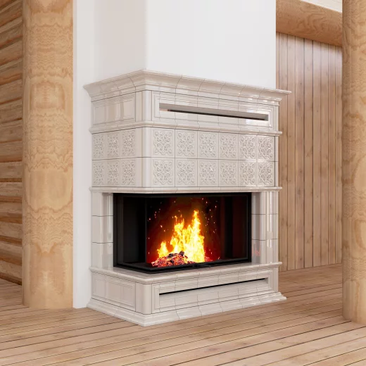 Камин с трёхсторонней топкой в изразцовой облицовке "Птички"