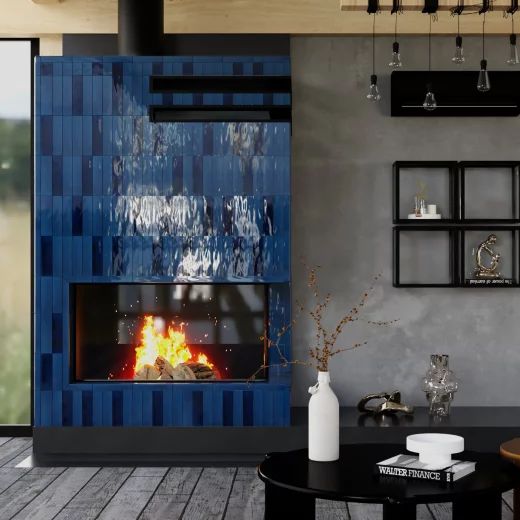 Камин с трёхсторонней топкой в изразцовой облицовке "Птички"