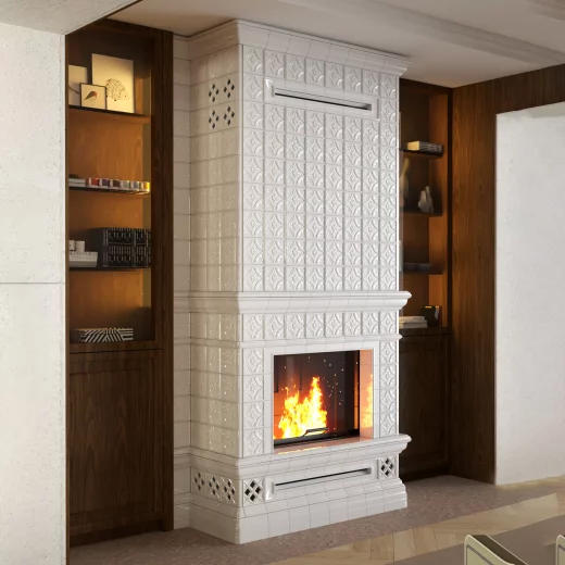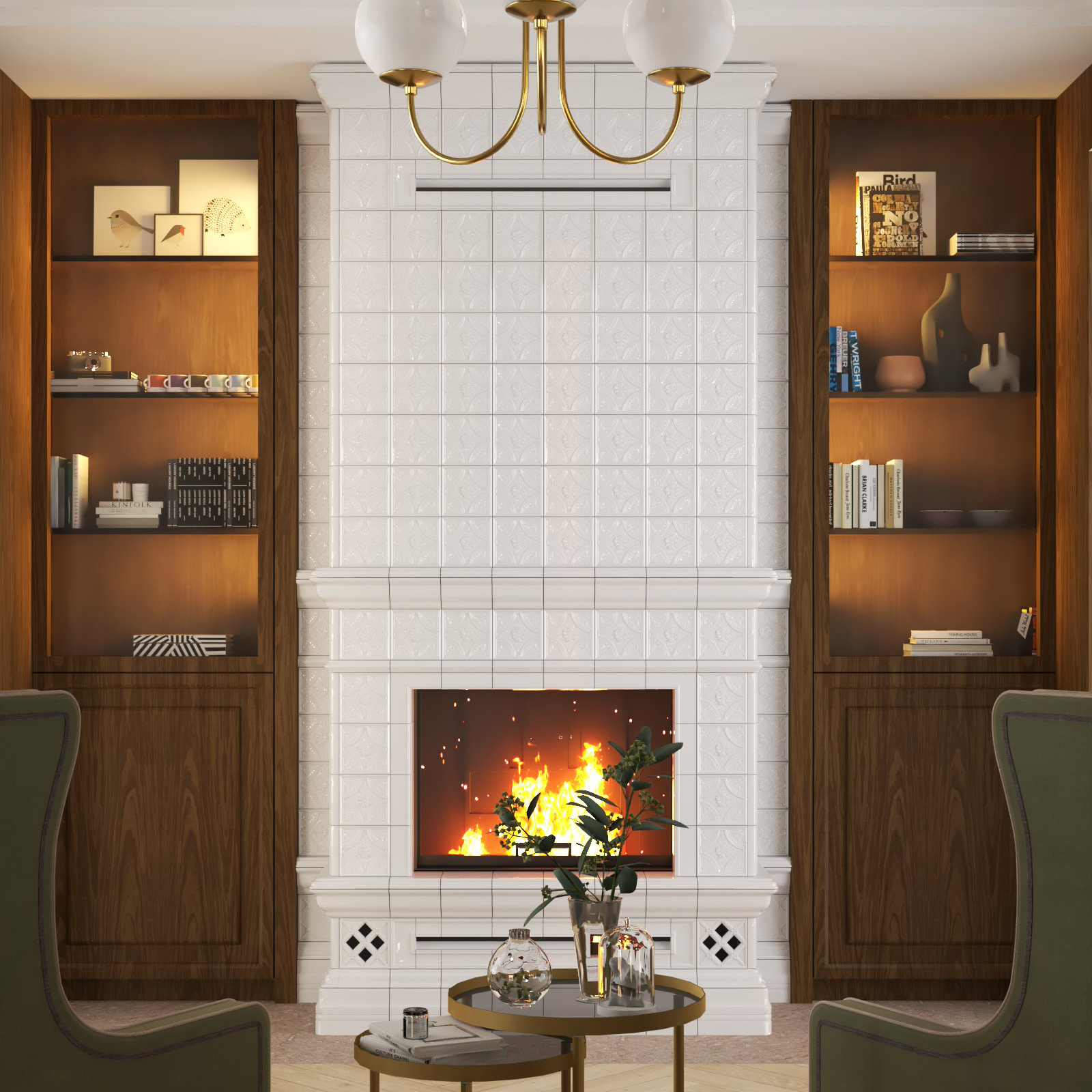 Проект облицовки классического камина в белом цвете с рельефными изразцами