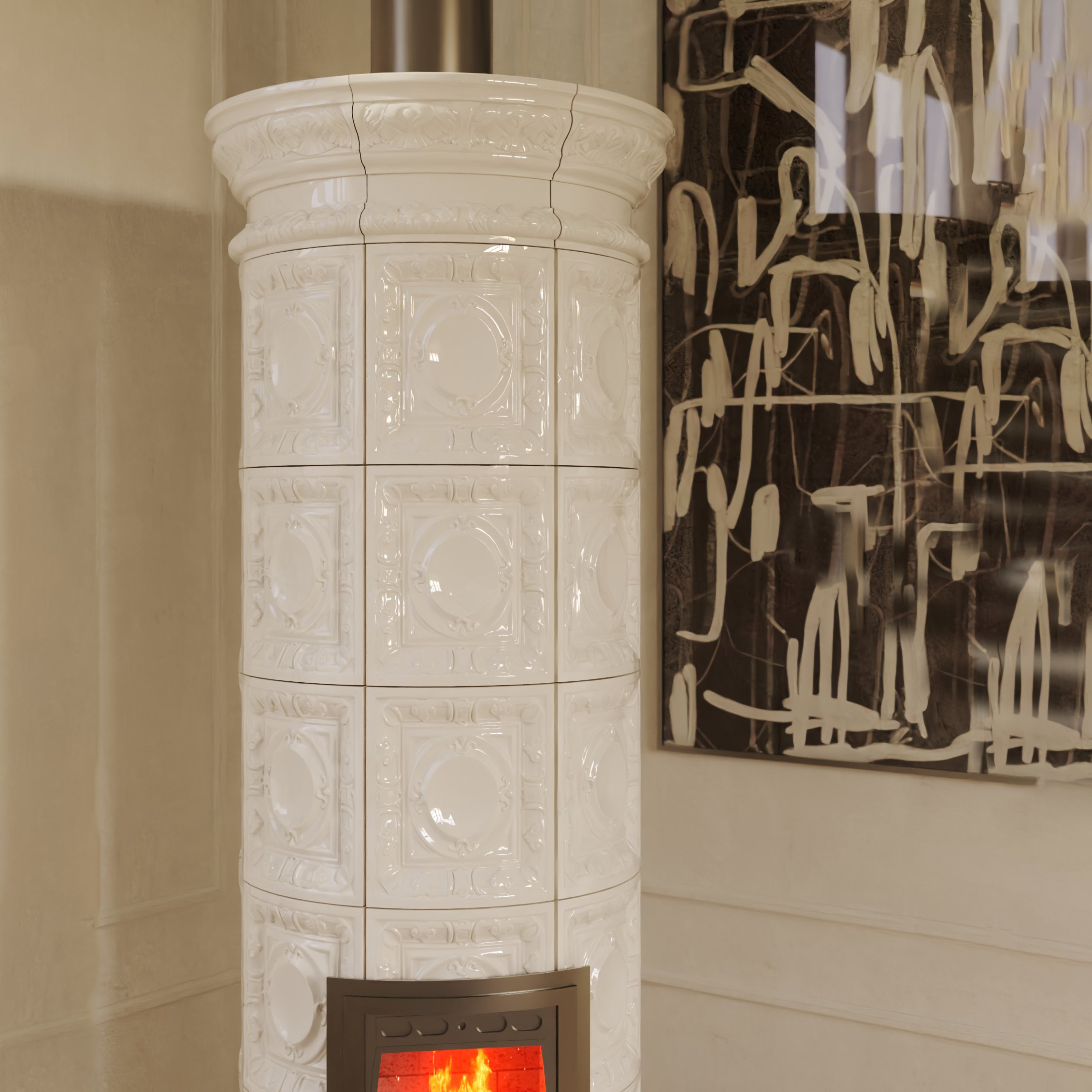 Подготовить проект облицовки круклого печь-камина в белом цвете.