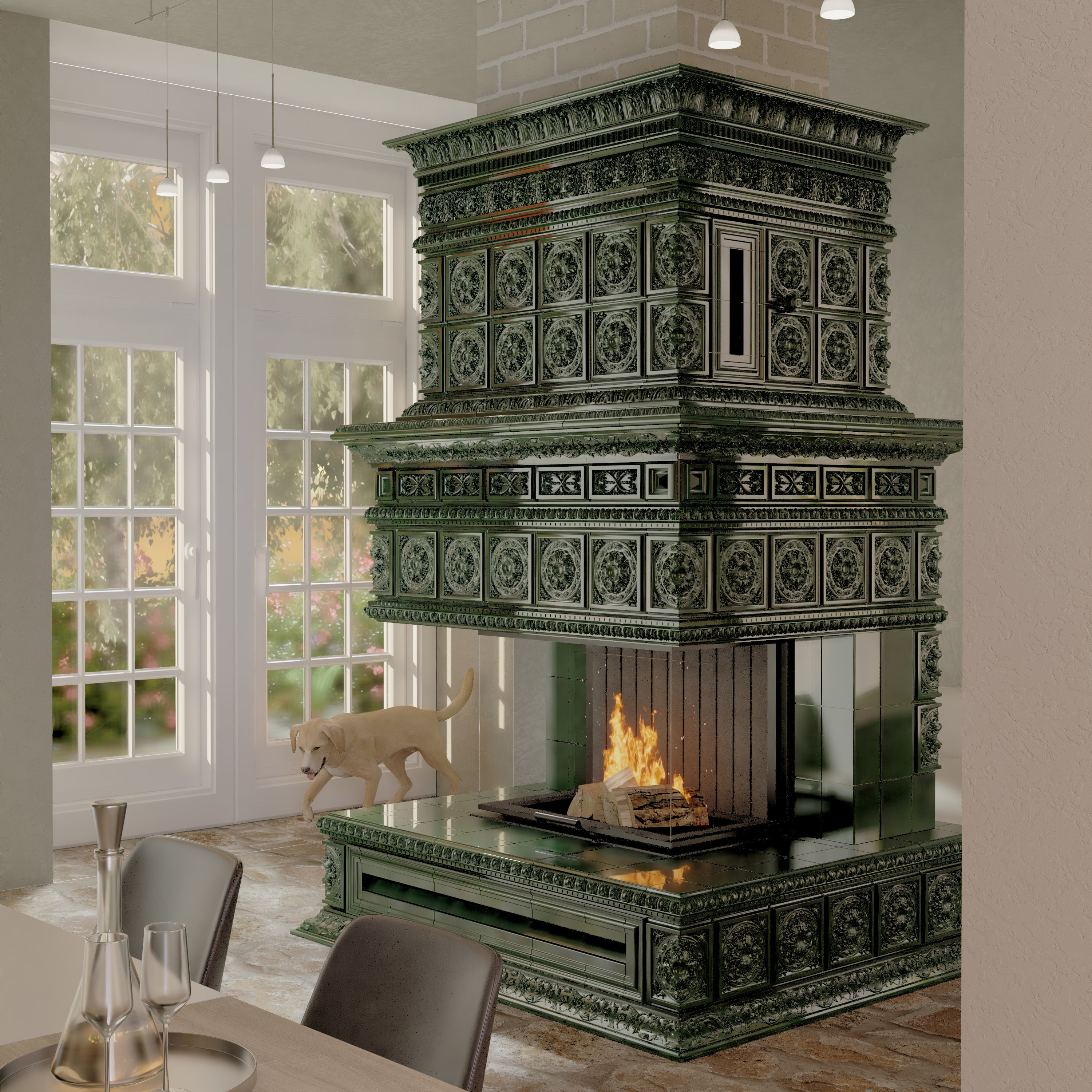 • камин в эксклюзивной изразцовой облицовке ручной работы.