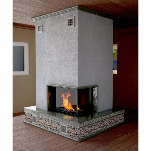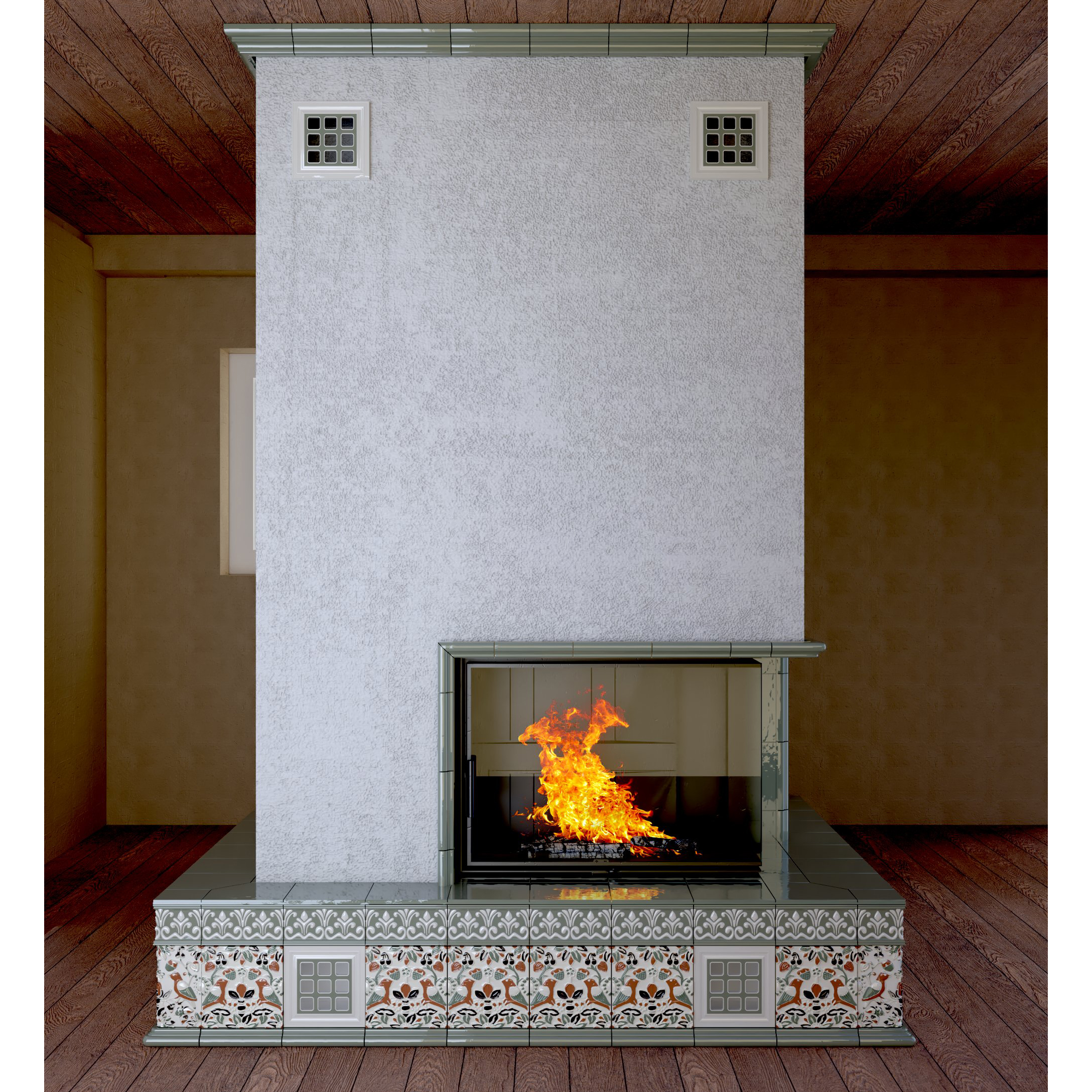 Камин с трёхсторонней топкой в изразцовой облицовке "Птички"
