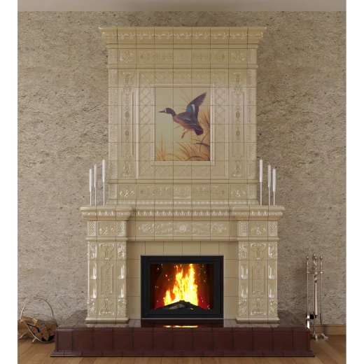 Камин с трёхсторонней топкой в изразцовой облицовке "Птички"
