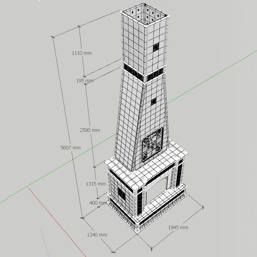 Подготовить проект облицовки существующего камина в охотничьем домике. Камин выстроен из кирпича, вокруг дымохода в форме трапеции, поднимается лестница. Изразцовая коллекция Птички, в светлых тонах.