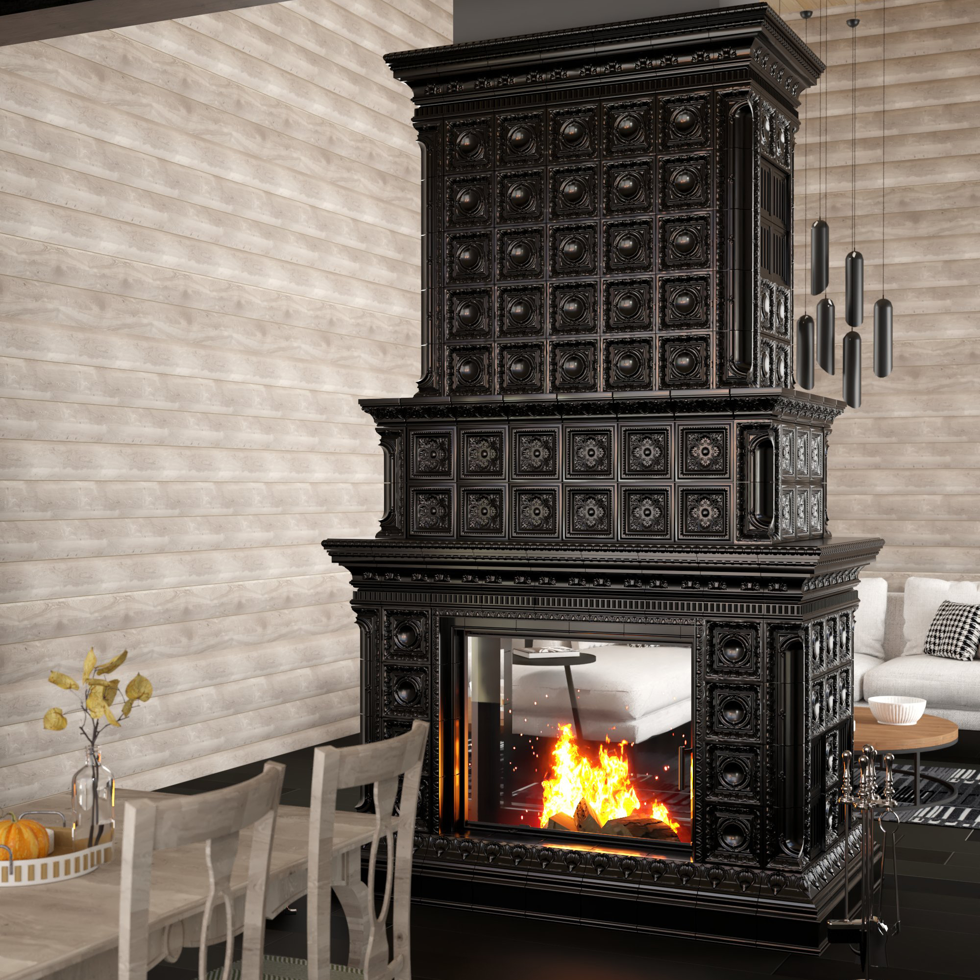 Камин с трёхсторонней топкой в изразцовой облицовке "Птички"