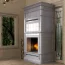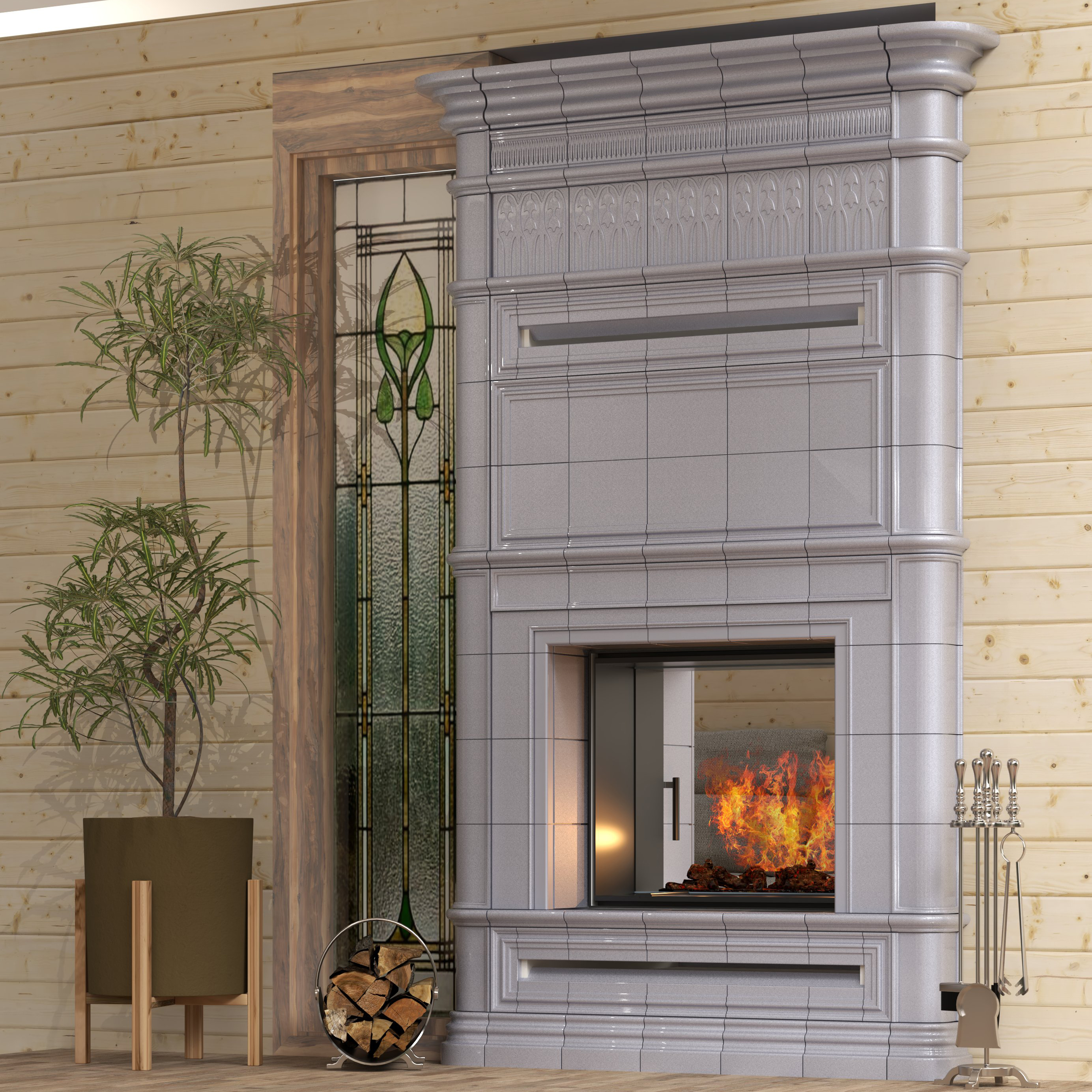 Камин с трёхсторонней топкой в изразцовой облицовке "Птички"