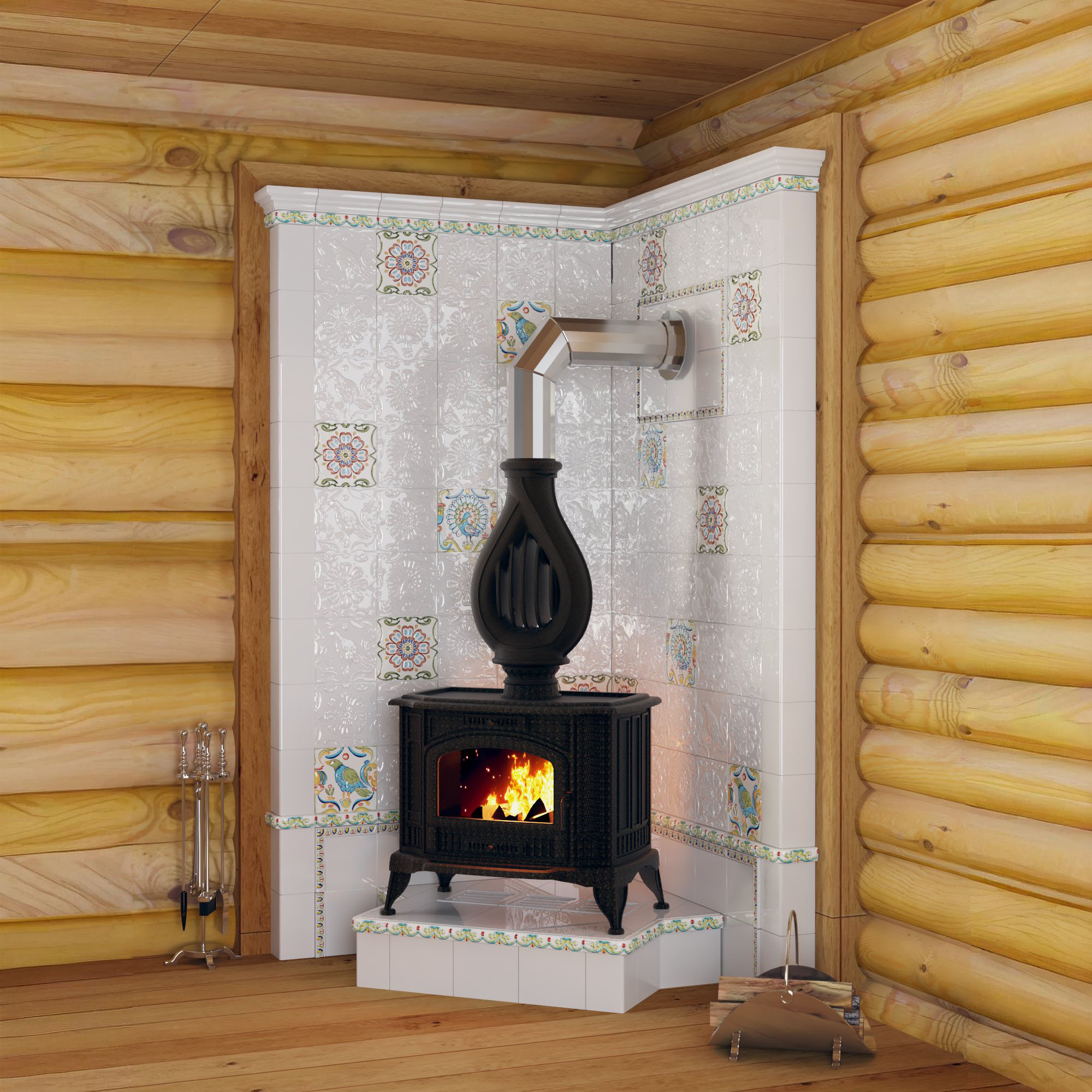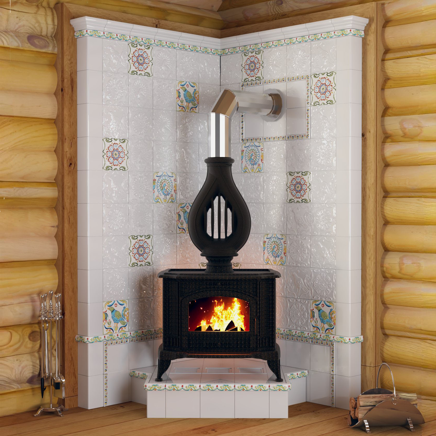Печь-голландка с изразцами CeramicaDecor в интерьере деревянного дома