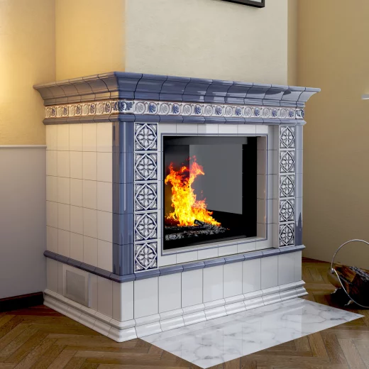 Камин с трёхсторонней топкой в изразцовой облицовке "Птички"