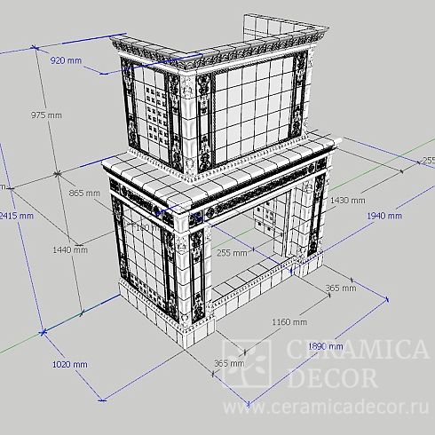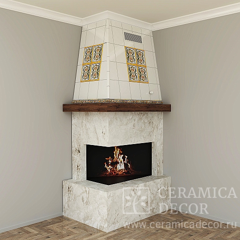 Подготовить изразцовую облицовку верхней части топки Дельта 900 с сохранением концепции и цветовых решений дизайн проекта заказчика.