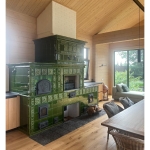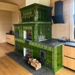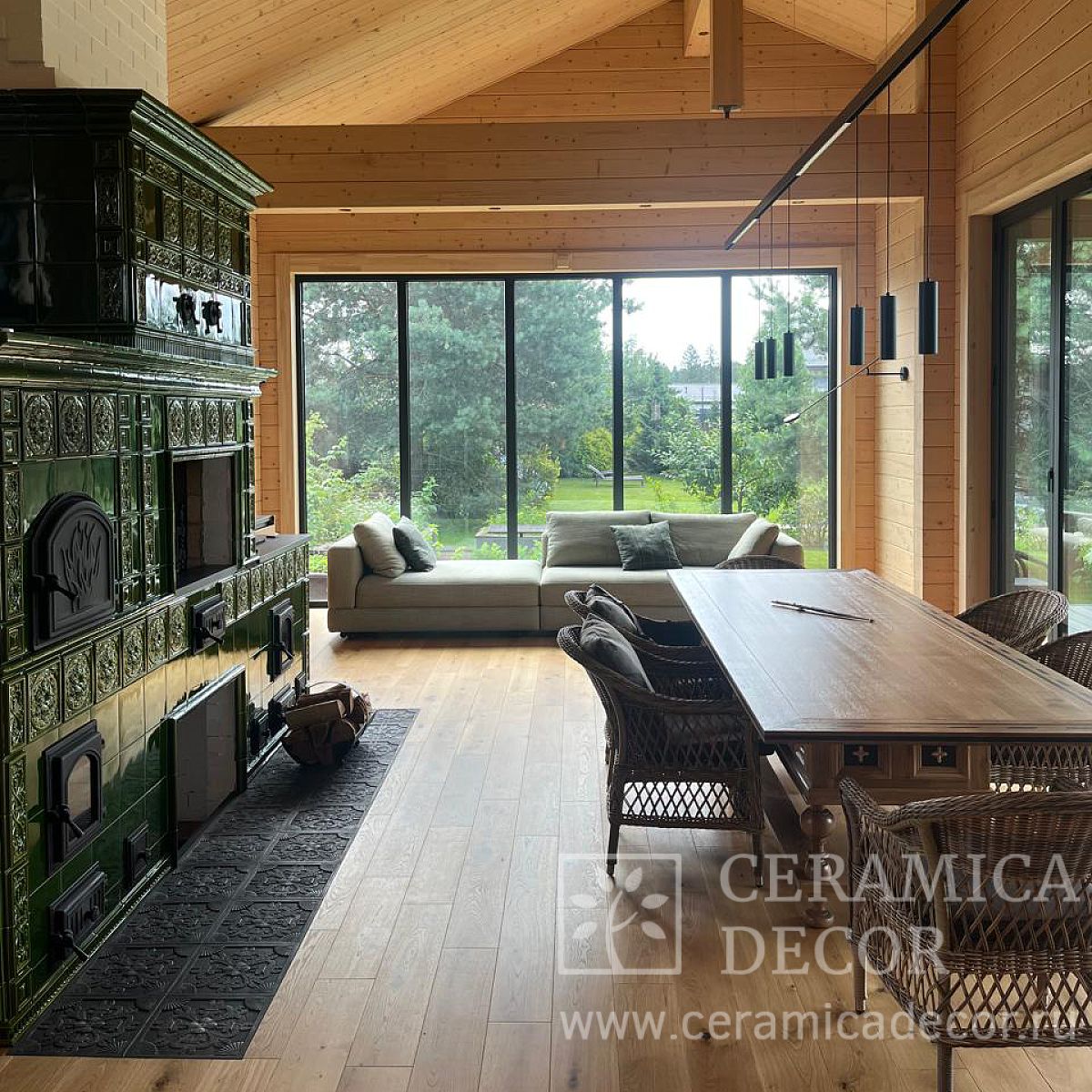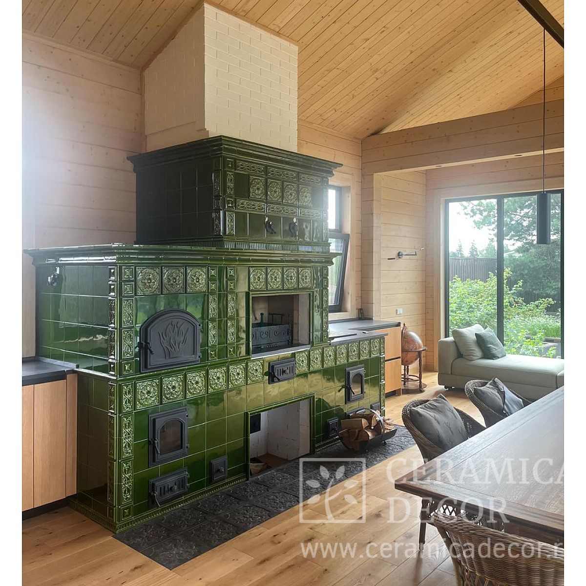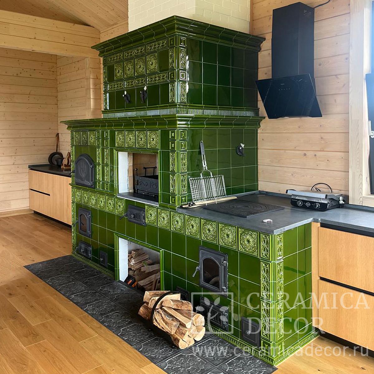 Использовать изразцы с разным рельефом из коллекции Элеганс. Цвет зеленый.
