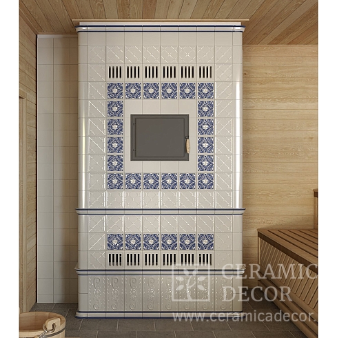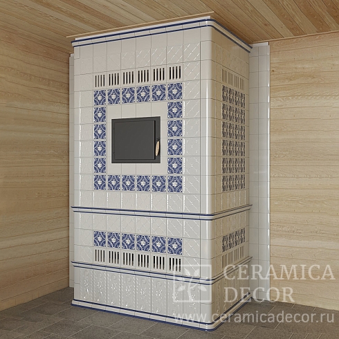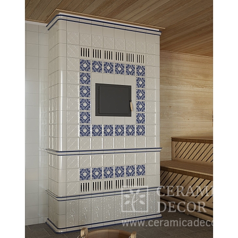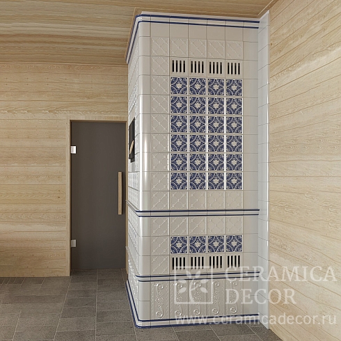 Подготовить проект облицовки банной печи в бело синей гамме.