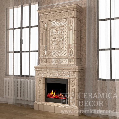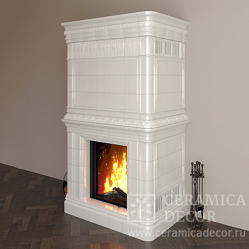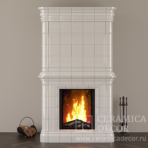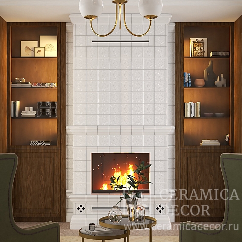 Подготовить проект облицовки классического камина в белом цвете с рельефными изразцами.