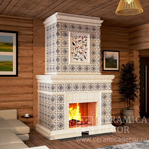 Подготовить проект облицовки декоротивной печи в спальне в белых изразцах коллекции Альбион.