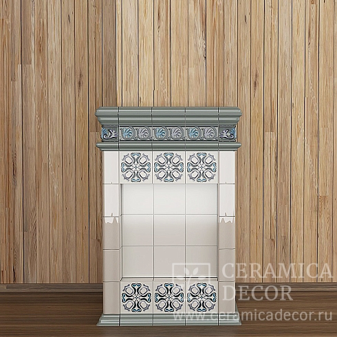 Подготовить проект облицовки из существующих моделей с соблюдением архитектуры печи (карнизы, балясины на углах) и цветовой гаммы на визуализации. Элементы из коллекций Усадьба, Птички
